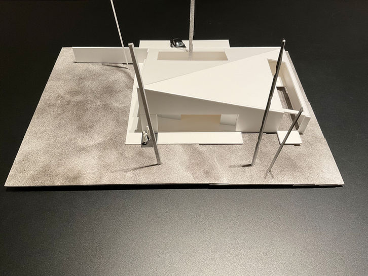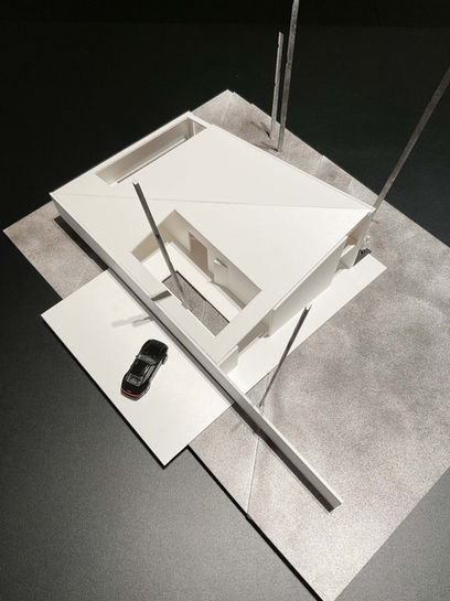 Ззовні архітектурний об'єм виглядає монолітним та цілісним. Довга смуга огорожі плавно переходить в стіну двору та завершує геометрію будинку. Помітно лише прорізи в площині даху та активну горизонталь фасаду - огорожі.